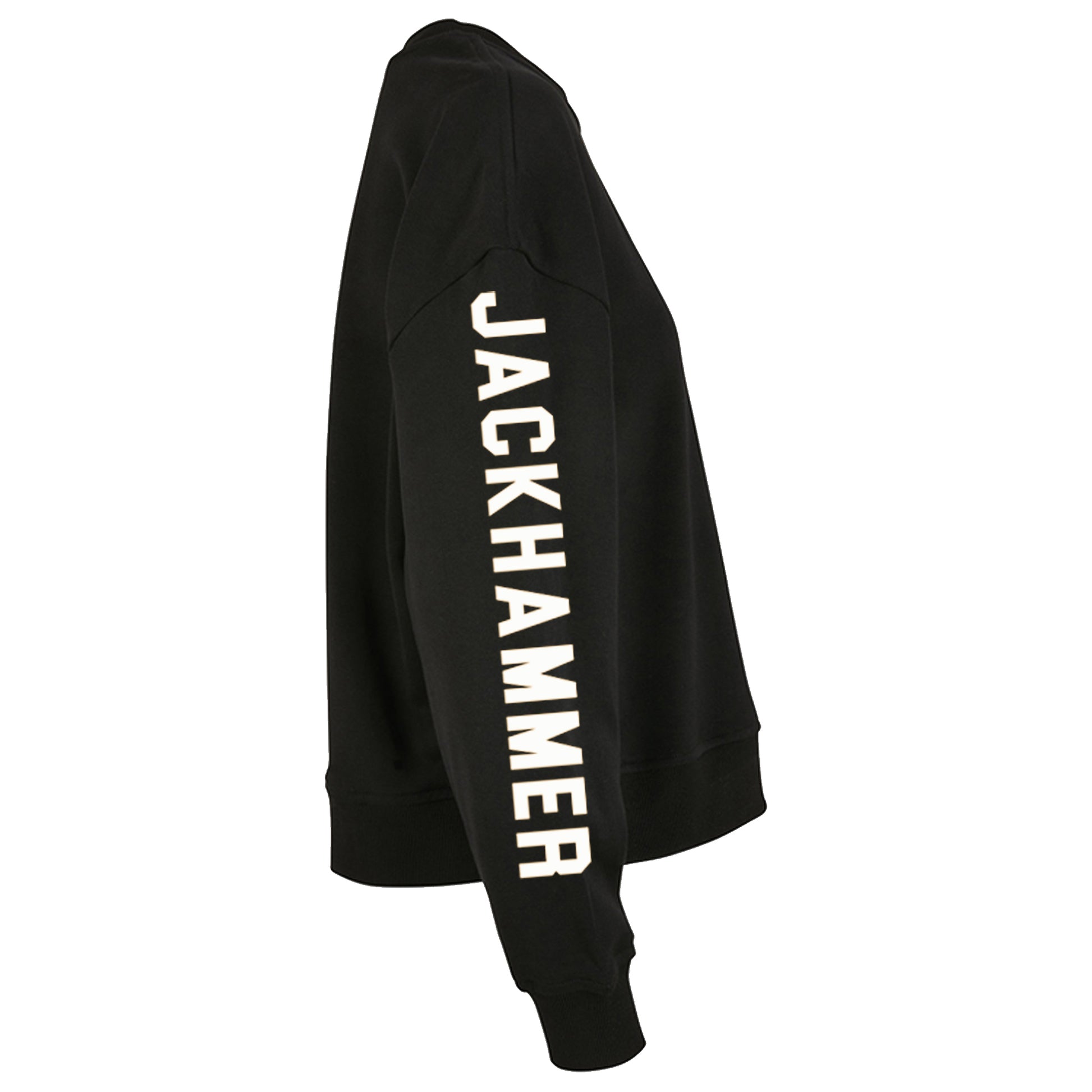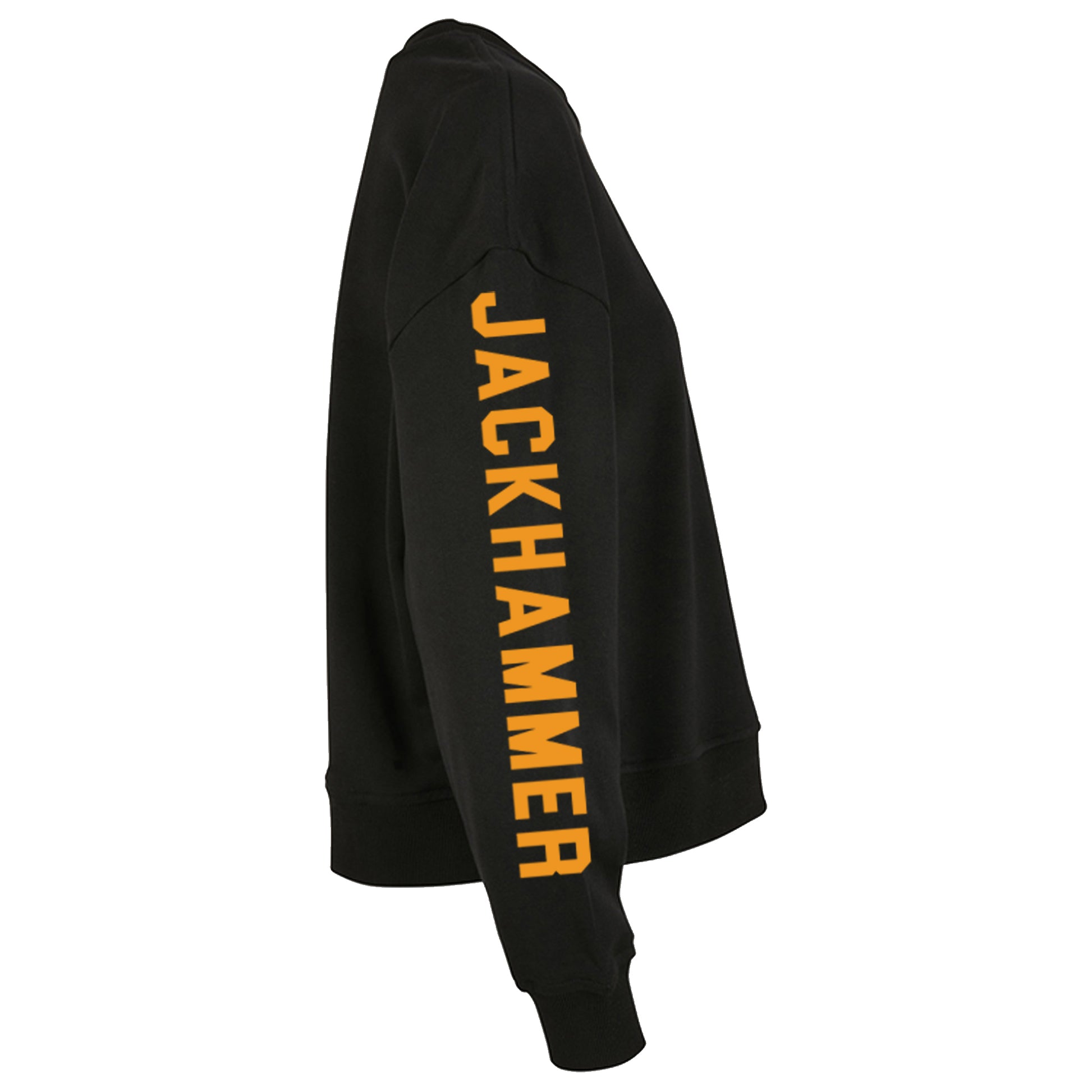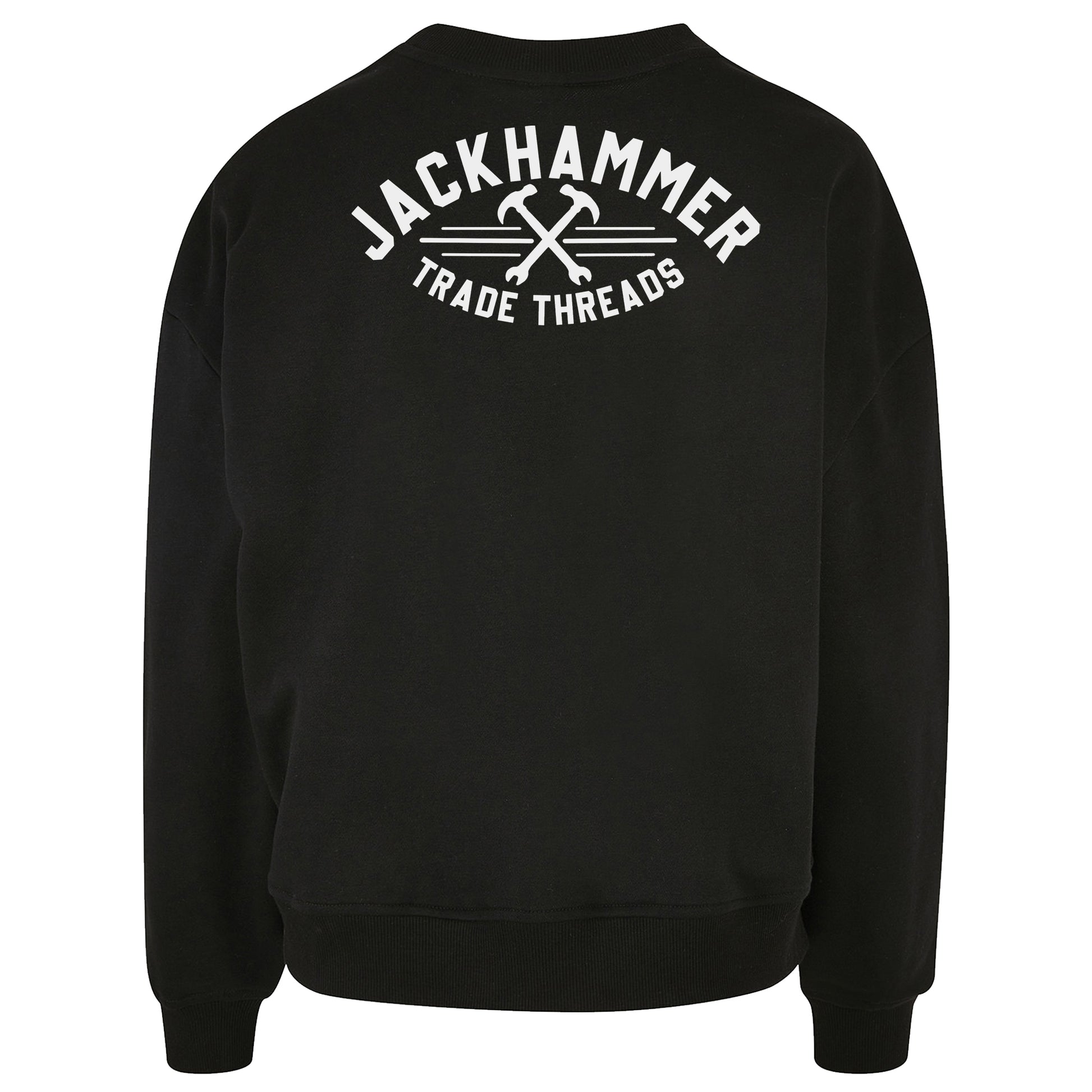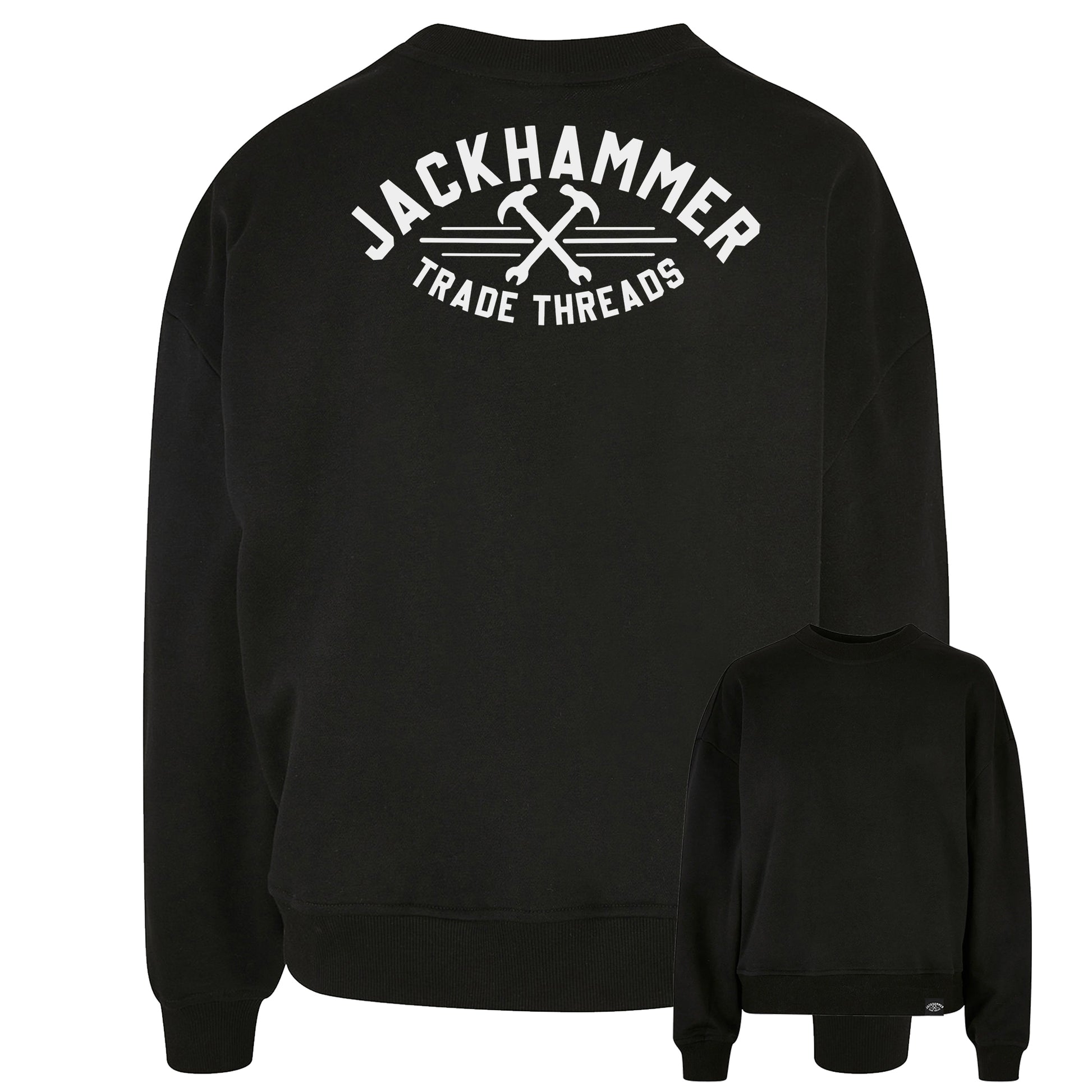 Rugged, oversized black sweatshirt designed for comfort and style. Bold Trade Threads logo across the shoulders, JACKHAMMER down the sleeve, and a woven tag on the hem. Print available in white or yellow.